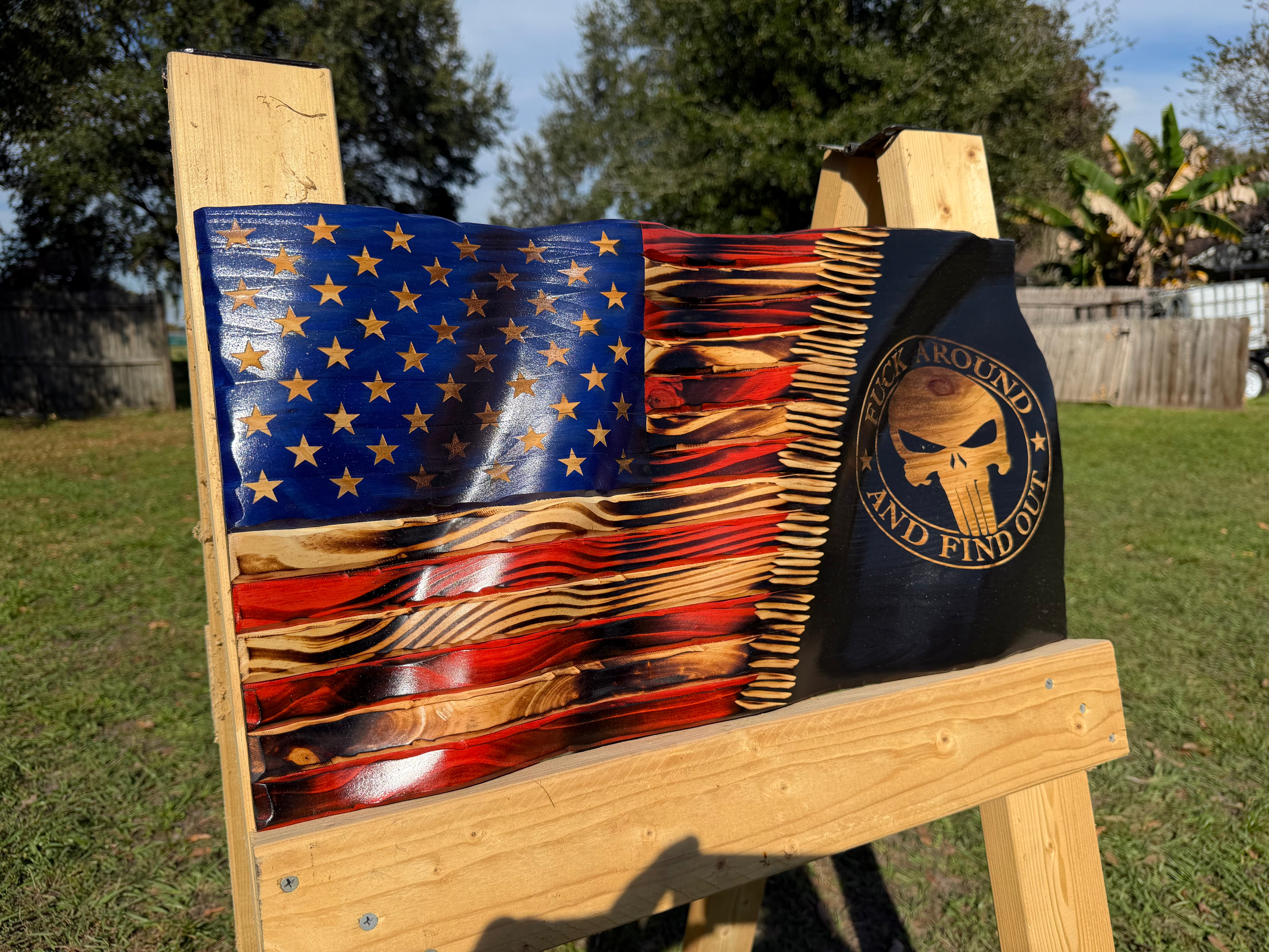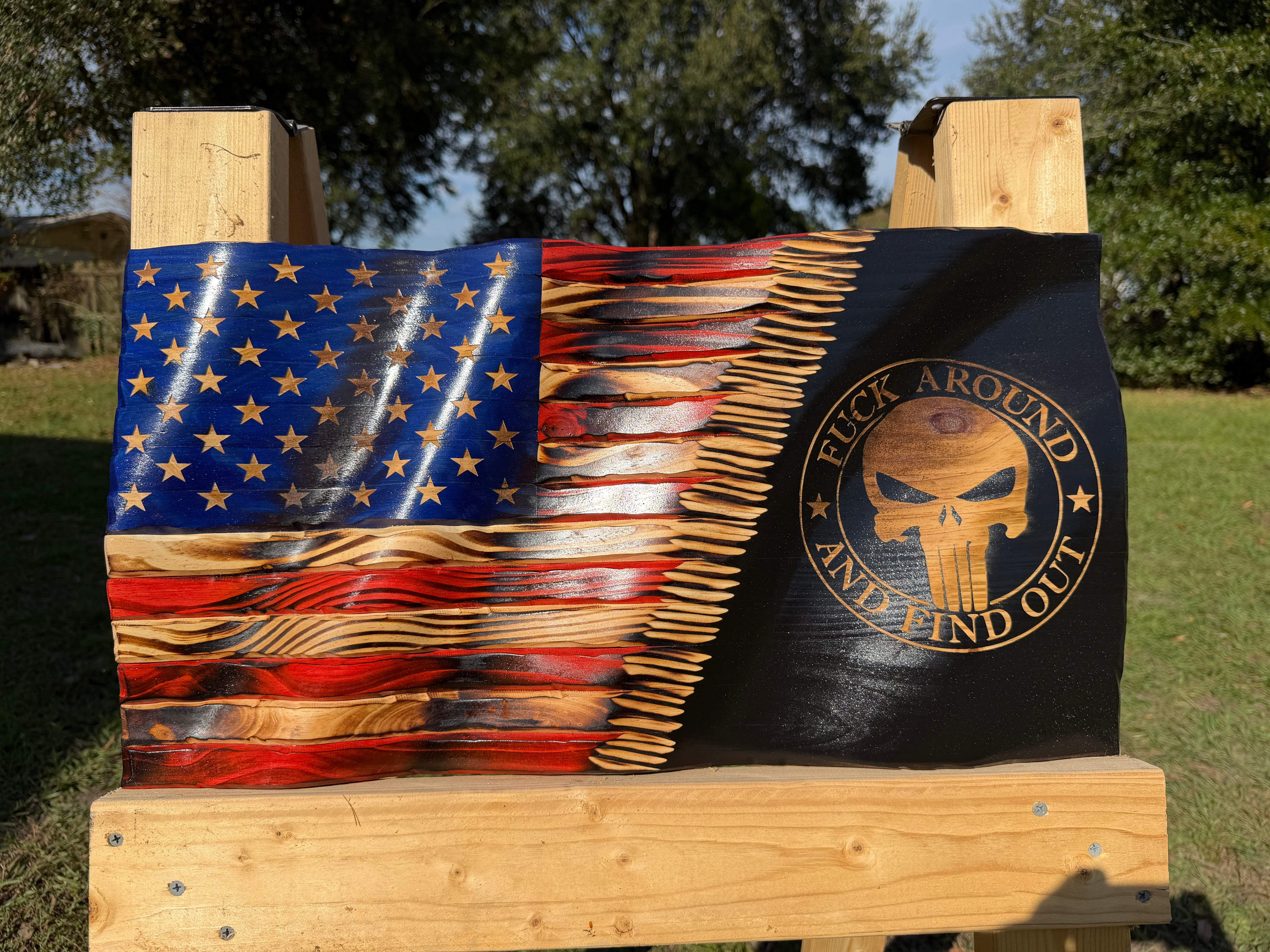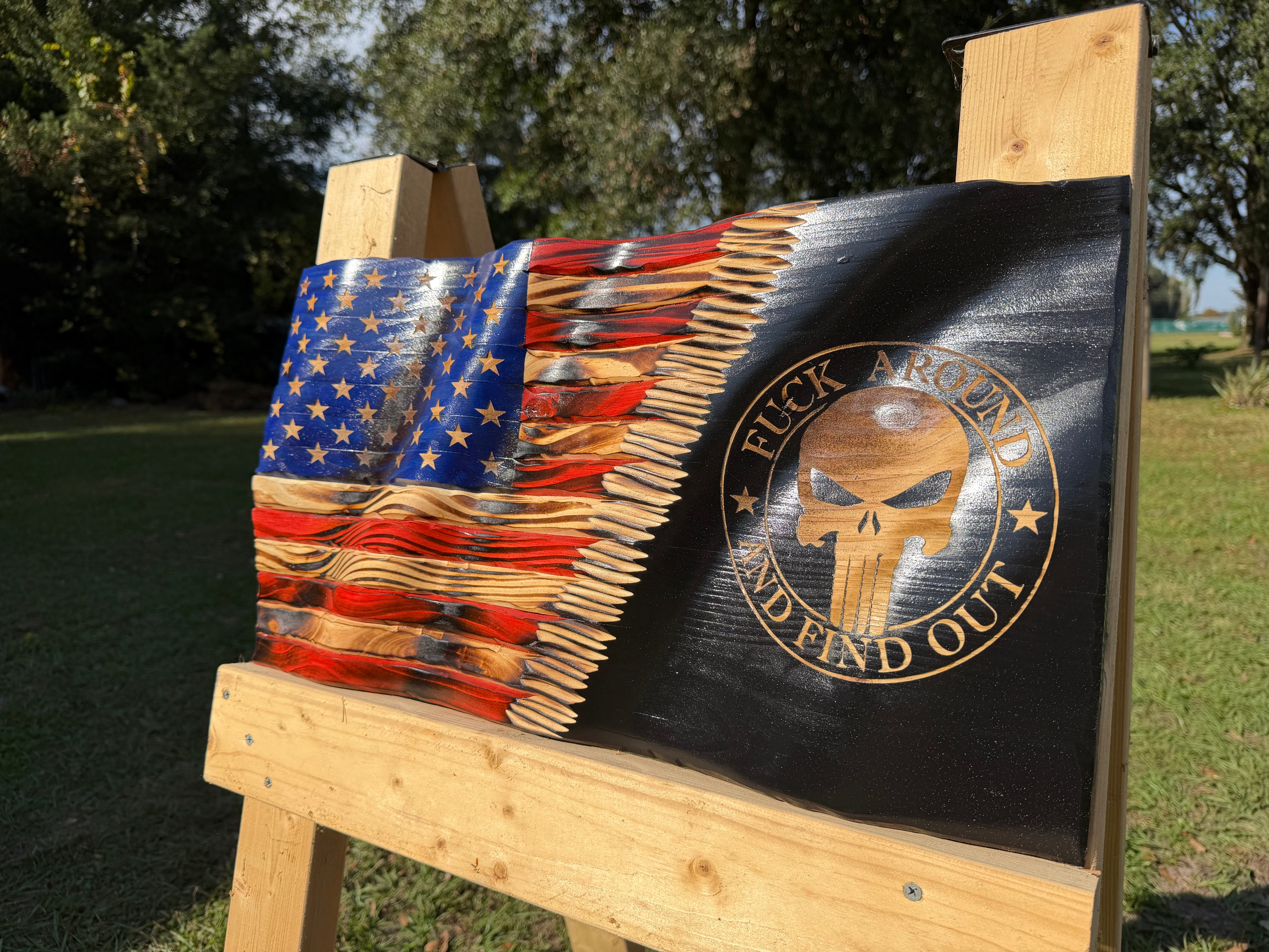 Each flag is hand-carved and features clean lines and sharp detail. The popular phrase “FAFO” is engraved on the right side, creating a meaningful and eye-catching display piece.