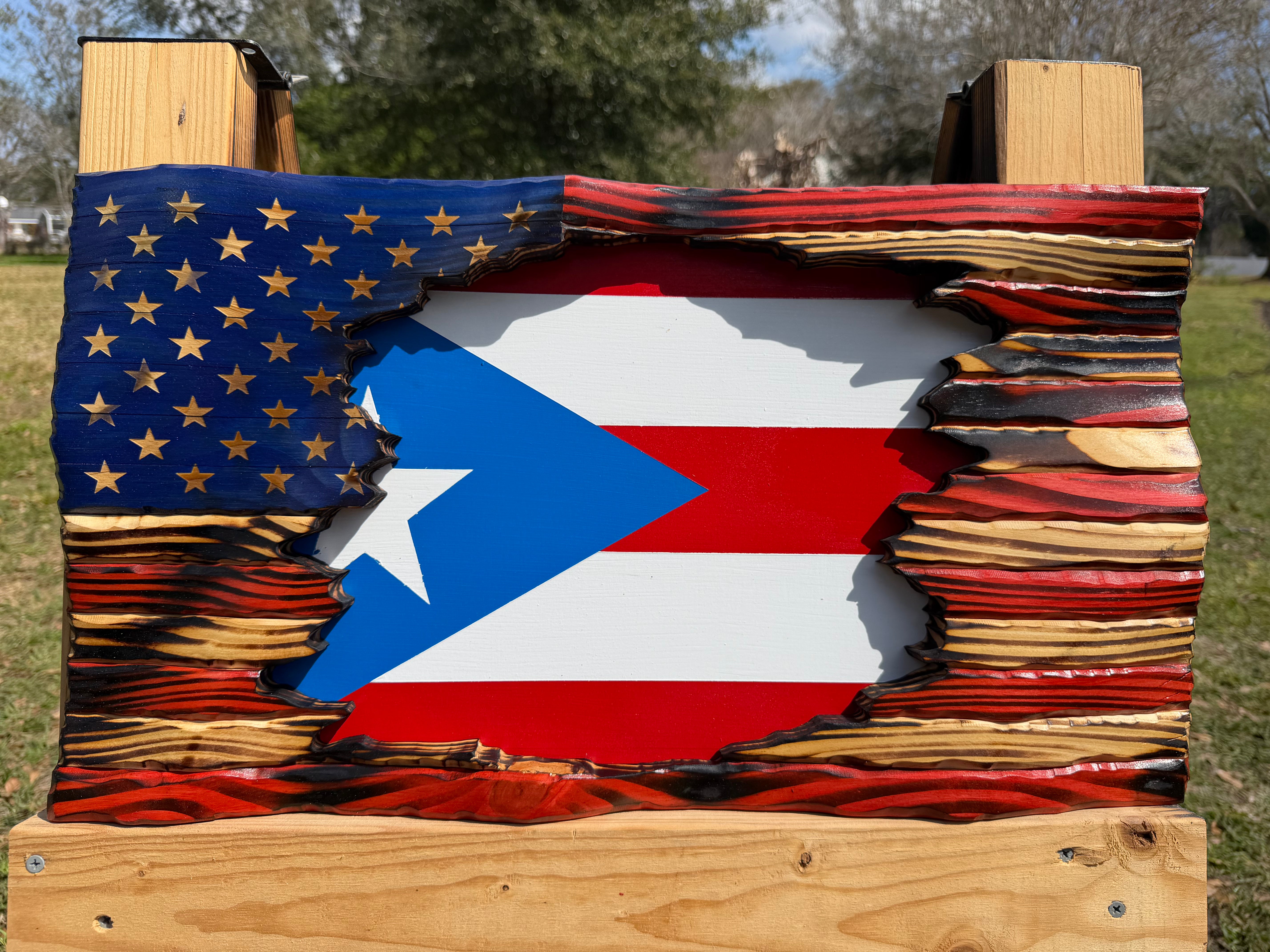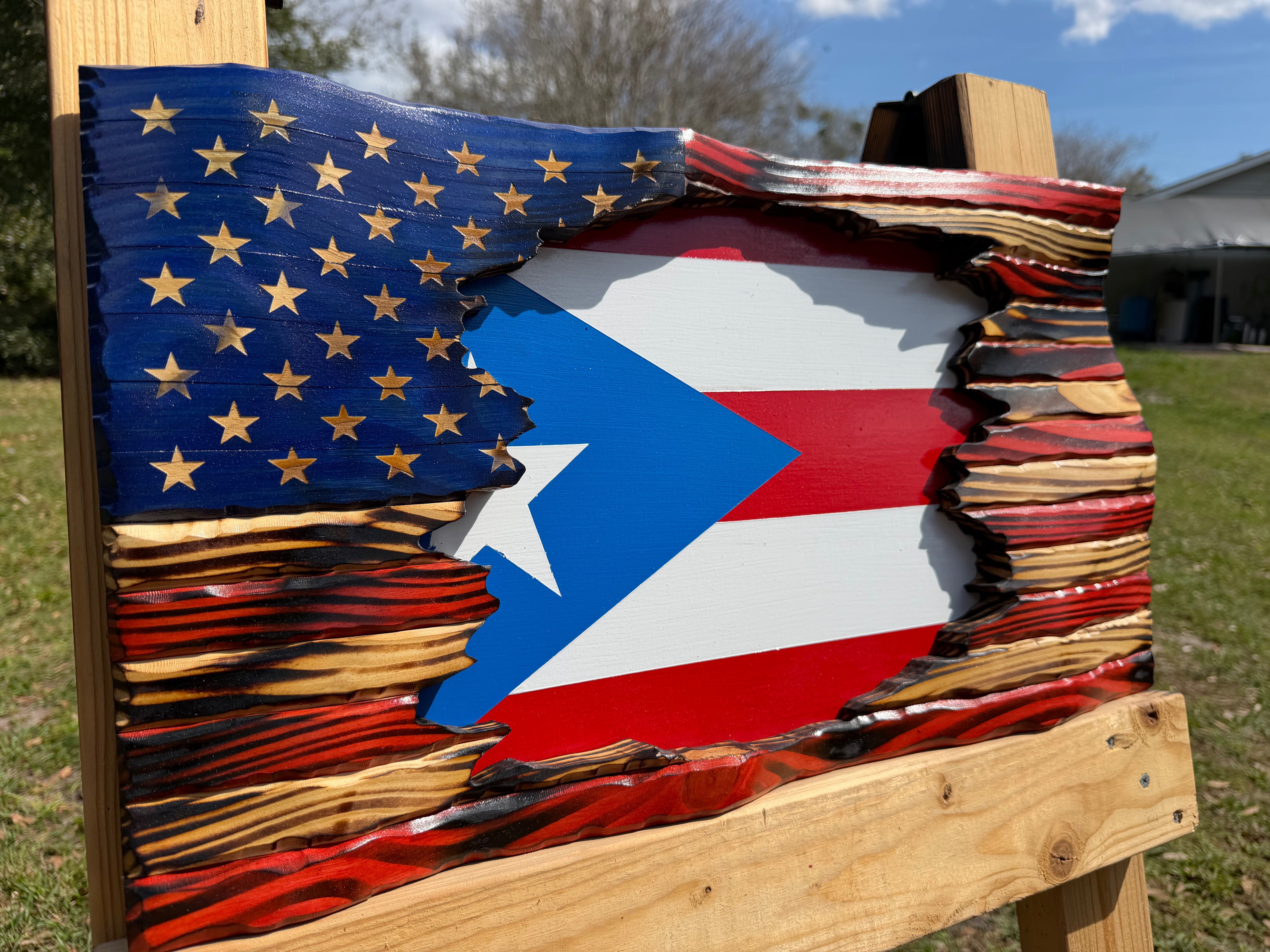Split Puerto Rican/American Wavy Wooden Flag - Medium 24x13 is backordered and will ship as soon as it is back in stock.