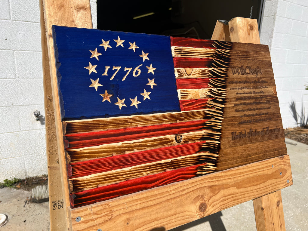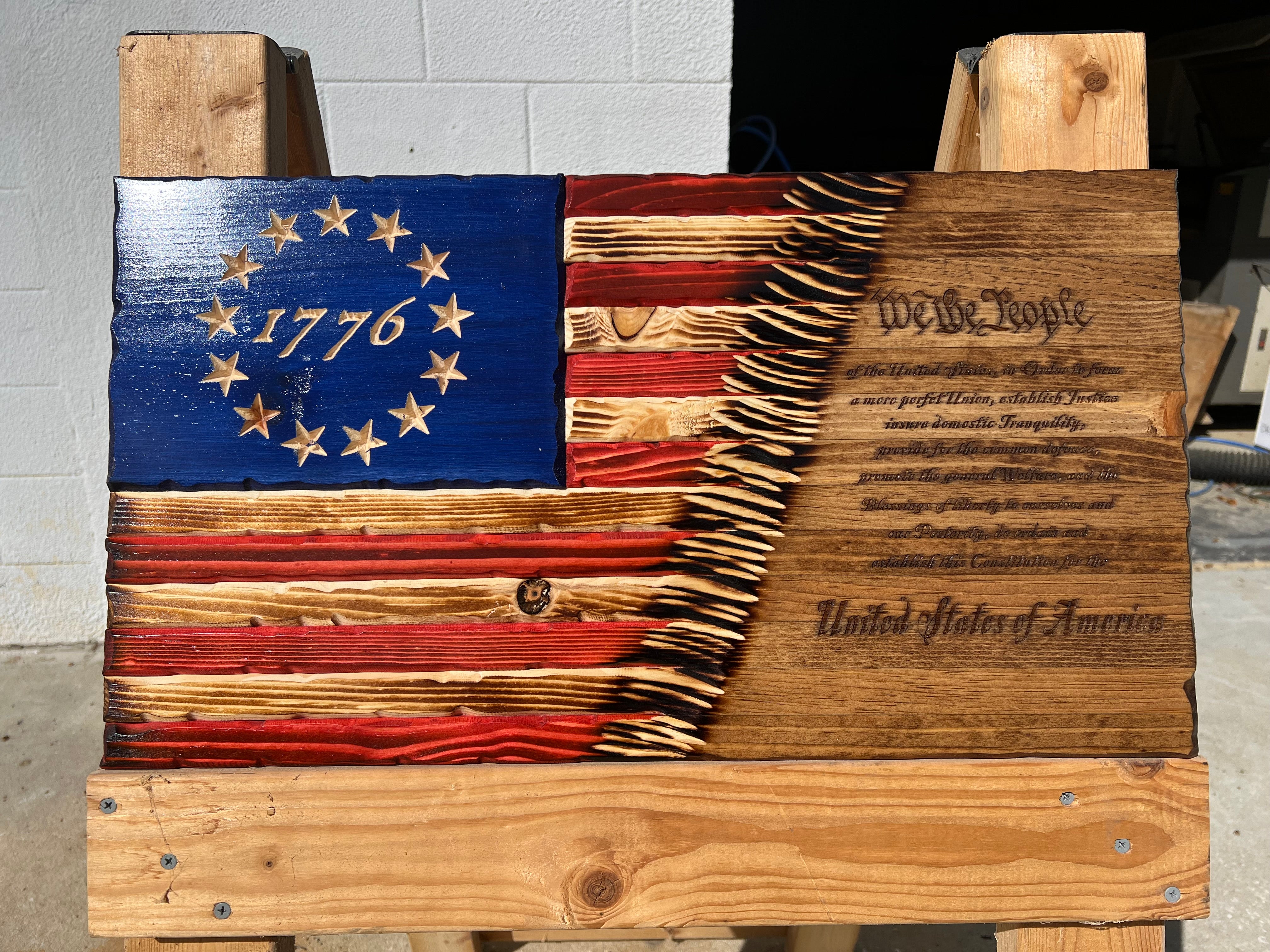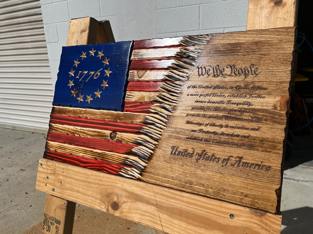 What truly sets this piece apart is the laser-engraved Preamble to the U.S. Constitution etched into the right-hand side, offering a timeless tribute to the values that define America: liberty, justice, and unity. The bold stars and stripes are enhanced by the wood’s natural grain and a durable, protective finish to ensure lasting beauty indoors or out.