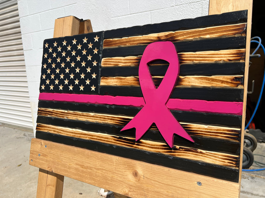 The thin pink line runs through the flag, and a breast cancer ribbon is raised on the right side as a centerpiece, honoring survivors and raising awareness.