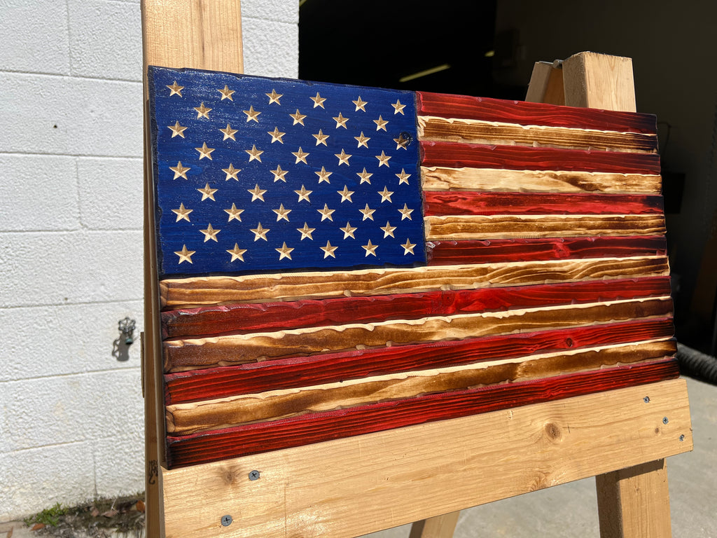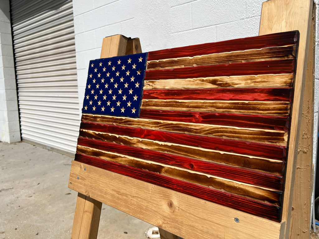 Each flag is built by hand from solid wood, sanded smooth, and hand-stained to bring out the natural beauty of the wood grain. Every stripe, star, and burn mark is carefully detailed — creating a one-of-a-kind piece that celebrates American craftsmanship and freedom.