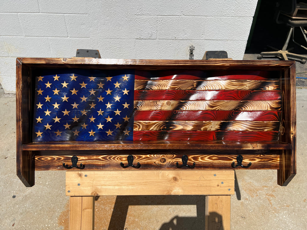 The top half showcases a beautifully hand-stained American flag, finished with a protective gloss coat to highlight the natural grain. The lower half features a set of durable metal hooks — perfect for holding keys, hats, coats, leashes, or gear.
