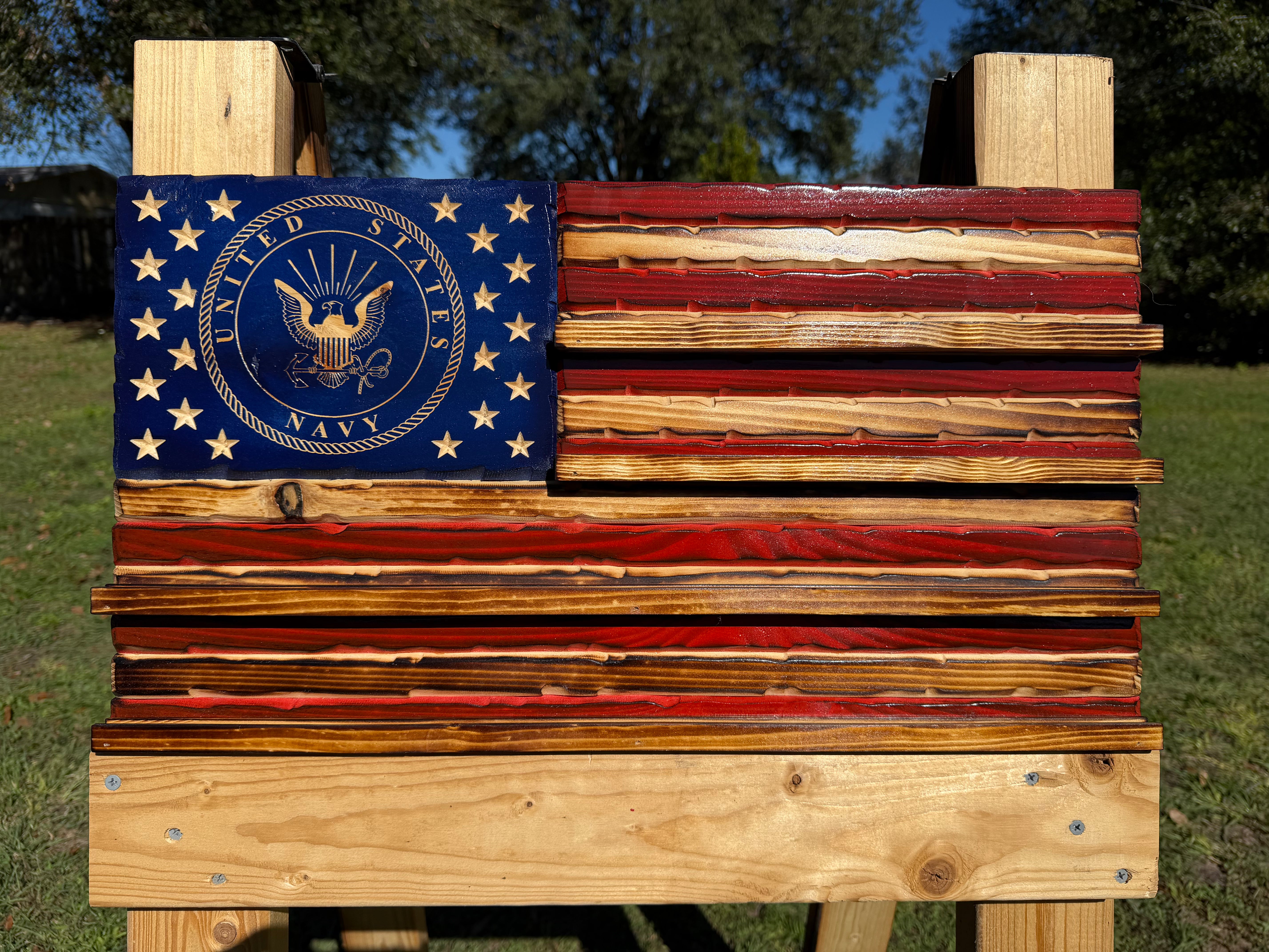Display your challenge coins with honor and pride in a unique coin holder display, all good and all wood. The Challenge Coin Holder Wooden Flag has shelves added to the stripes with enough space between to fit all your coins. Grooves hold your coins nicely in place. This design displays the U.S. Navy emblem mixed into the stars.