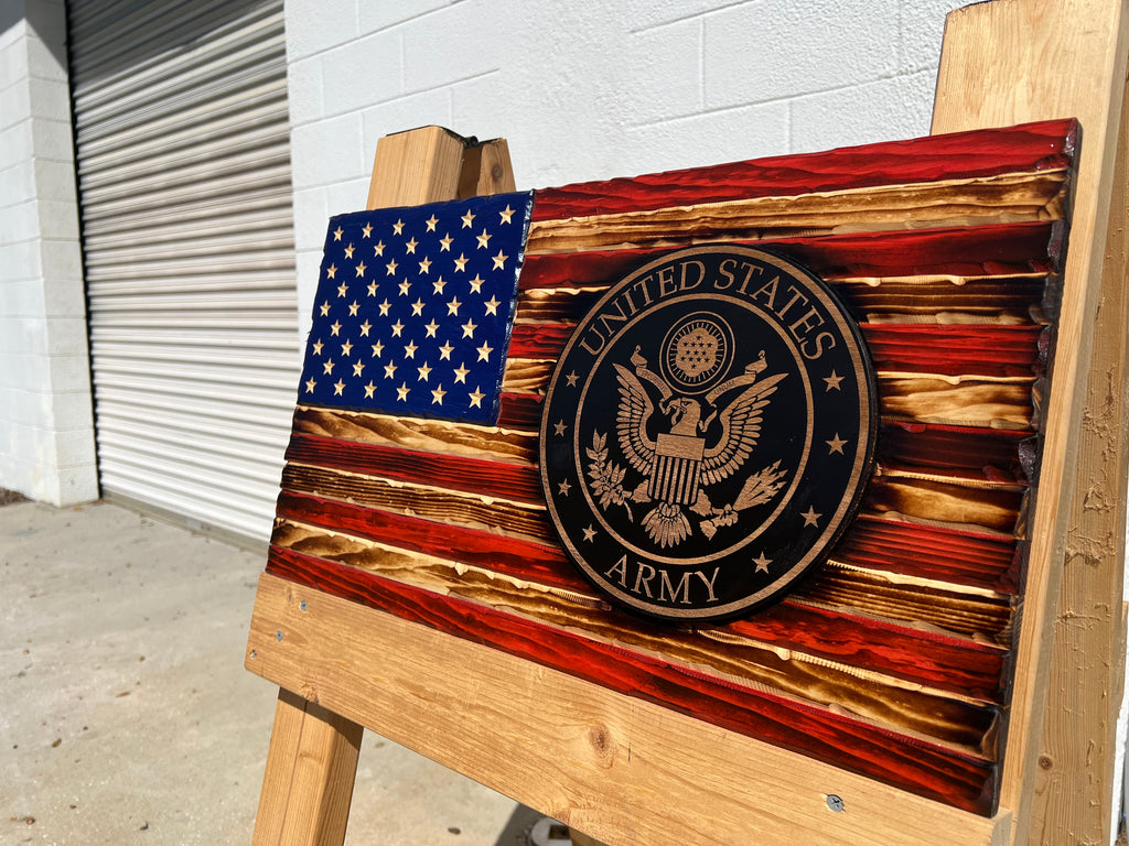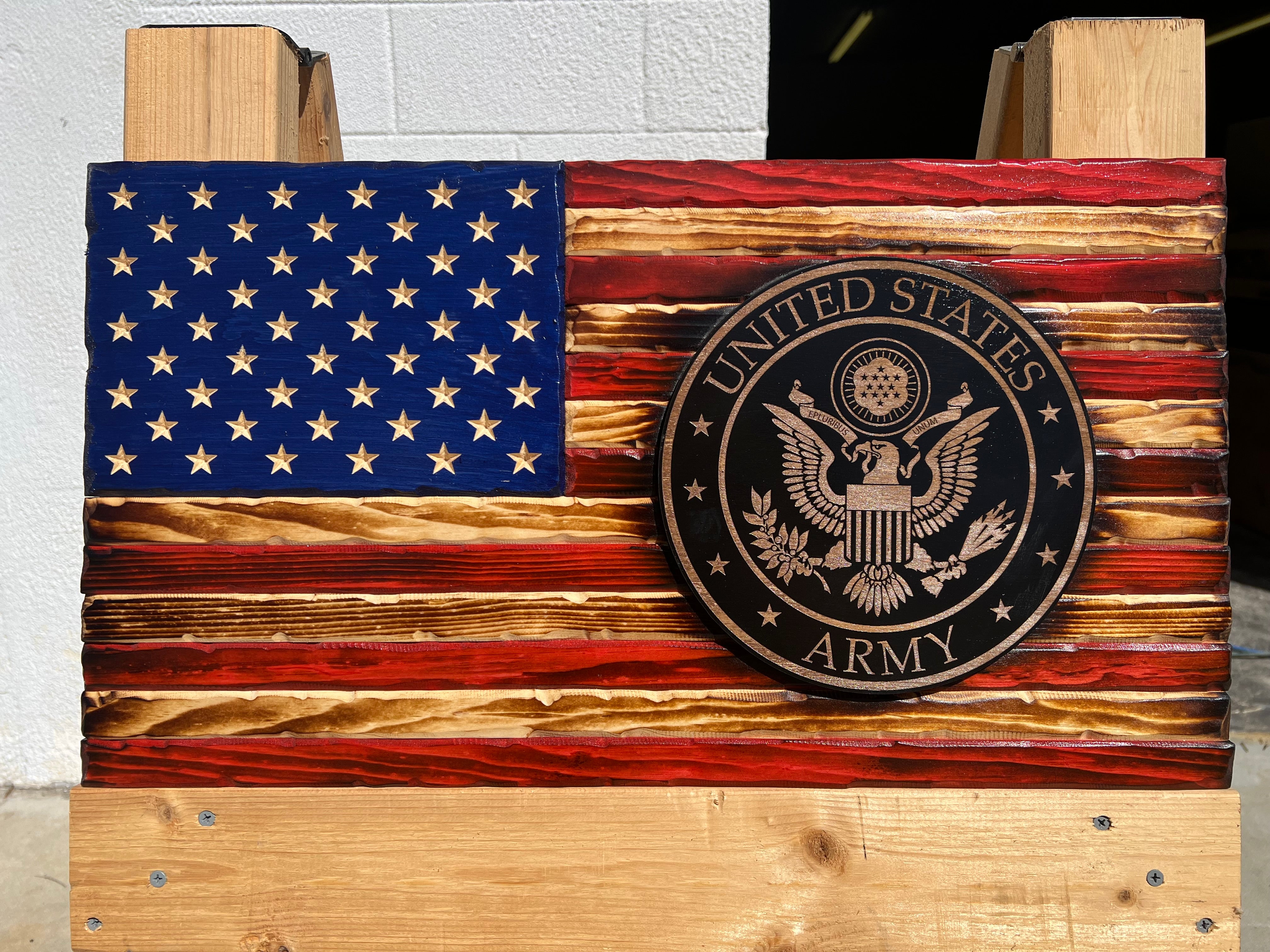 Show your pride for America’s finest with this handcrafted Wooden American Flag featuring a raised, laser-engraved U.S. Army logo. Each flag is carefully built from solid wood, layered for depth, and finished by hand for a durable, rustic look that commands attention.