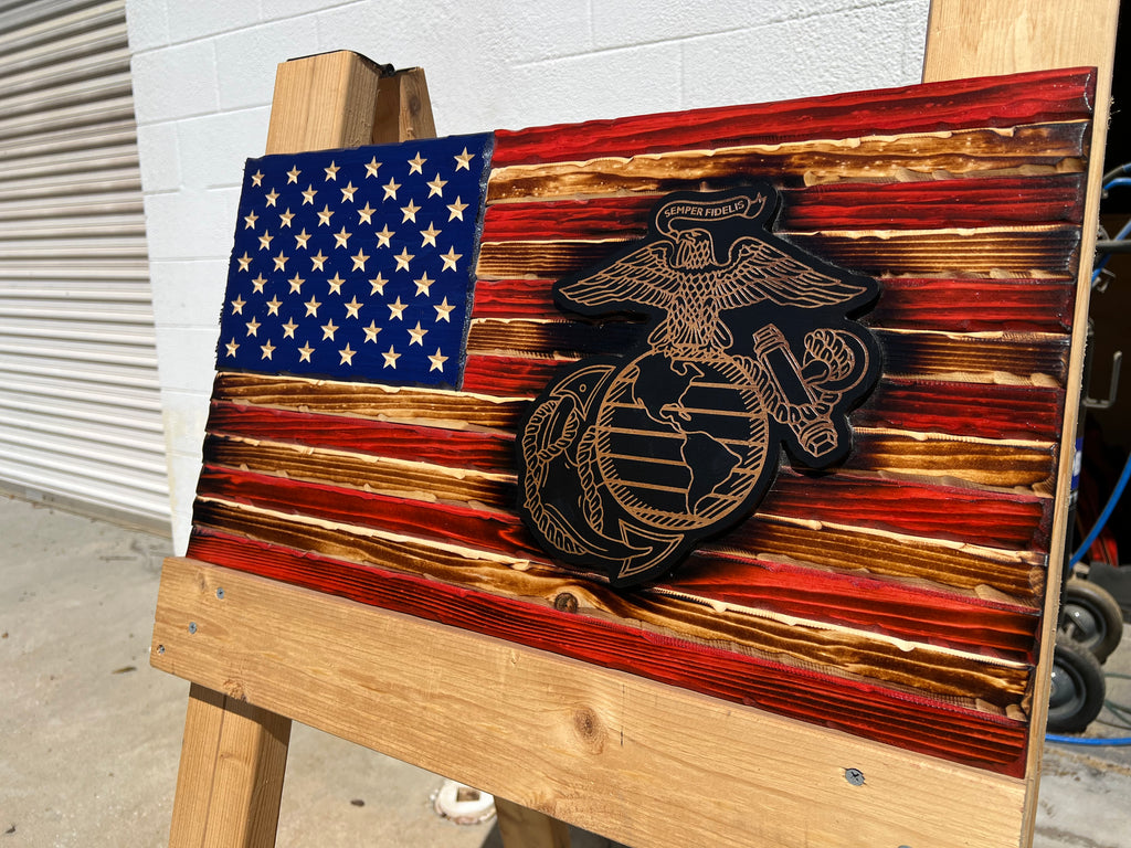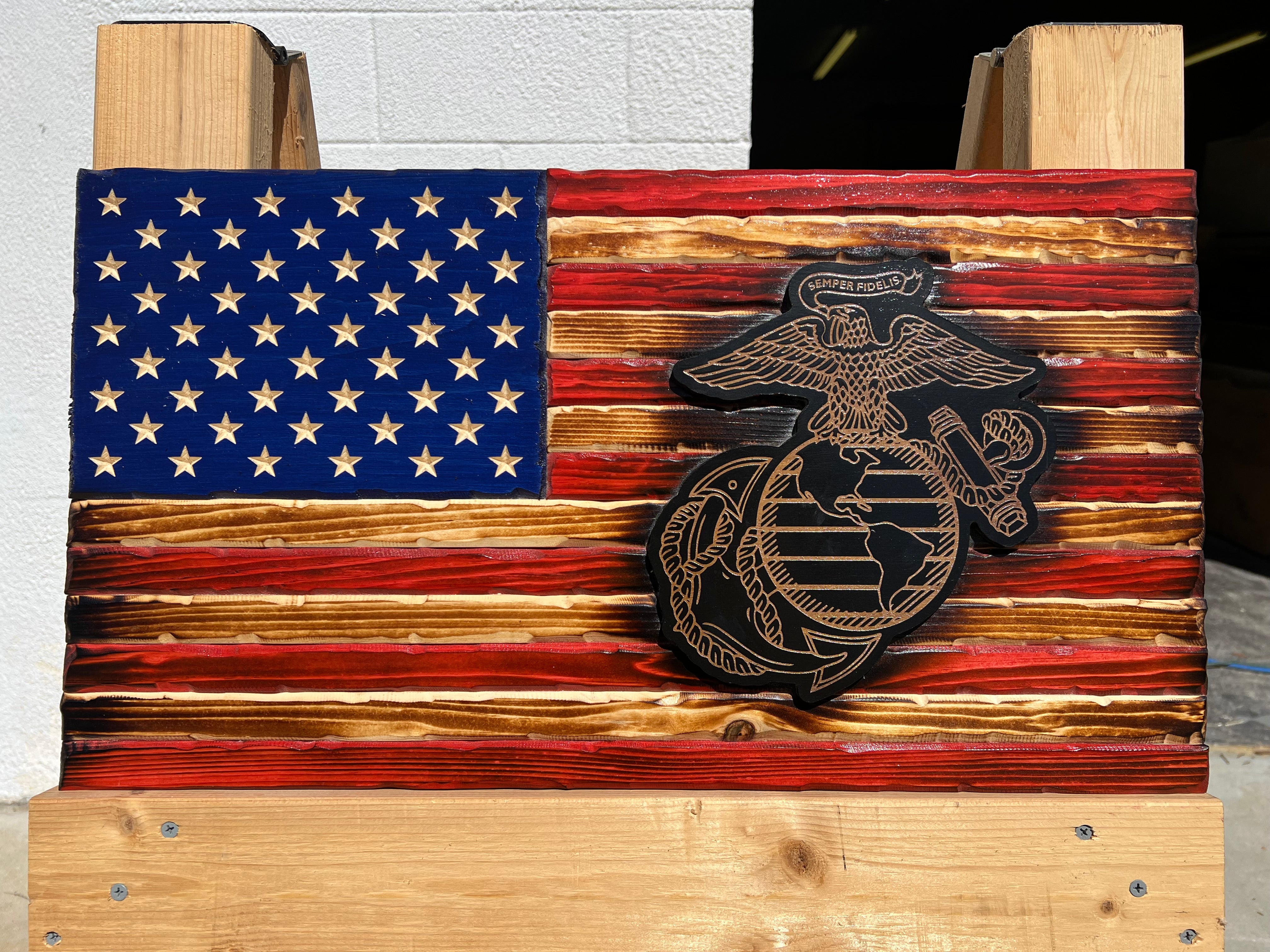 Honor the few and the proud with this handcrafted Wooden American Flag featuring a raised, laser-engraved U.S. Marine Corps logo. Each flag is meticulously built from solid wood, layered for depth, and stained to bring out the natural beauty of the grain.