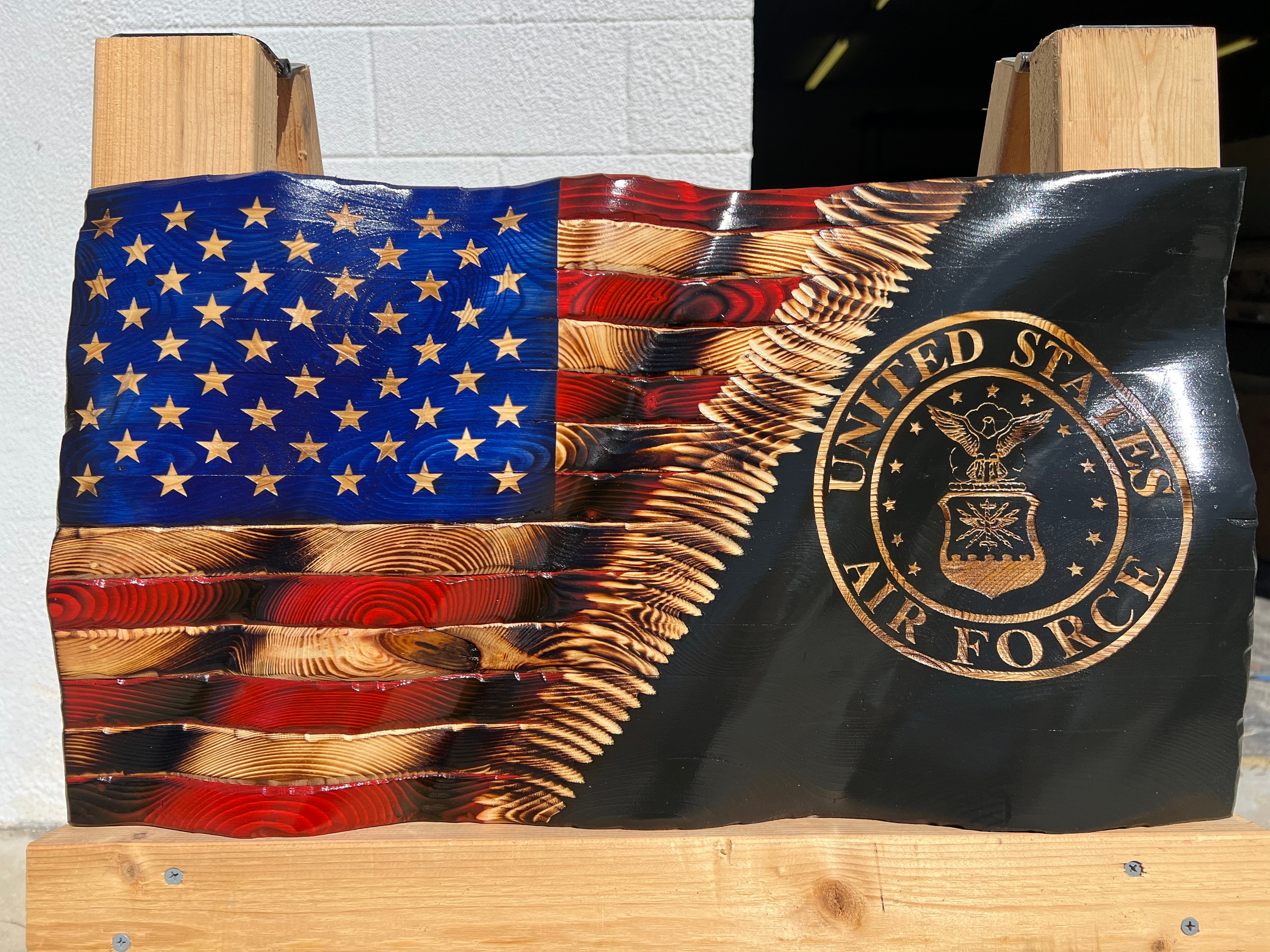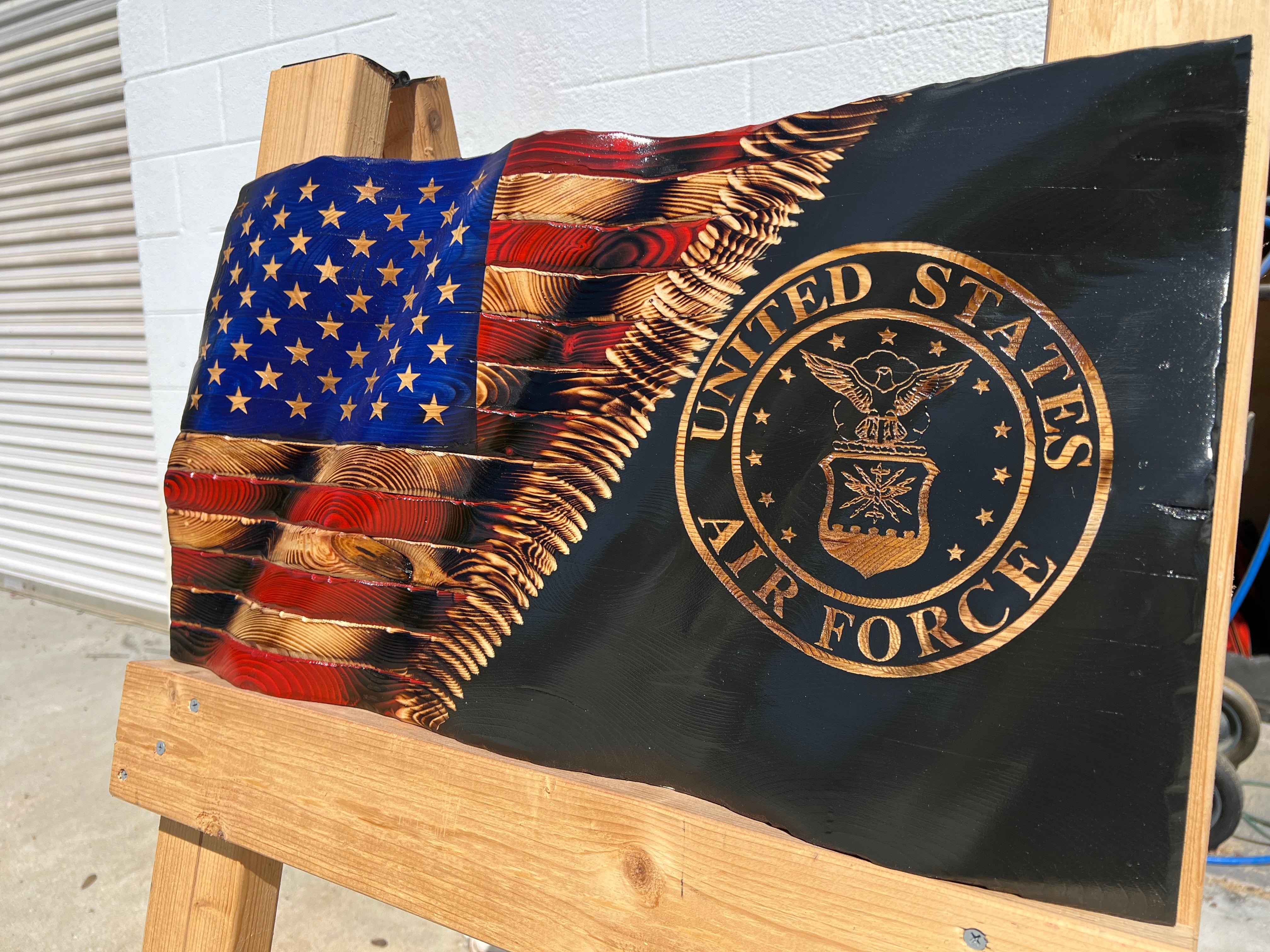 Celebrate the legacy and excellence of the United States Air Force with this stunning hand-carved wavy wooden American flag. Designed to capture both motion and meaning, this piece features smooth, flowing waves carved directly into the wood, giving it a lifelike and striking 3D appearance.