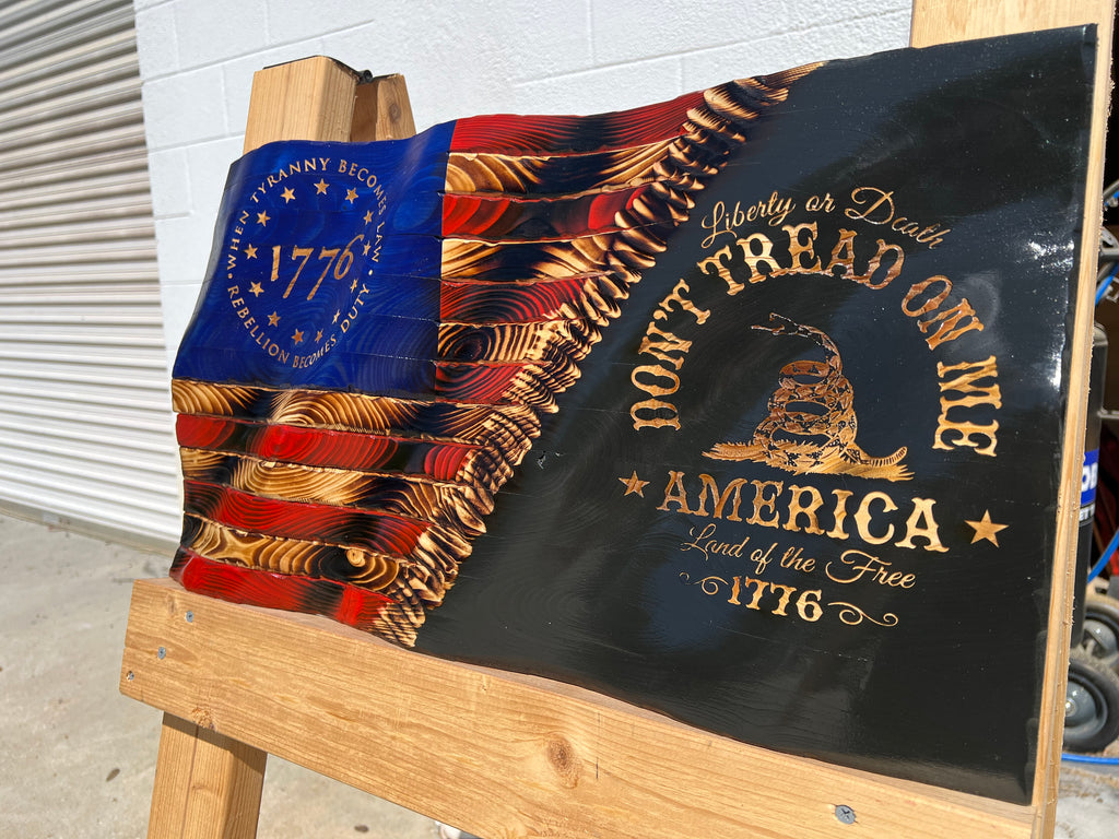 Make a bold statement of freedom and defiance with this handcrafted Wavy Wooden American Flag, featuring the iconic “Don’t Tread on Me” motto and Gadsden Snake laser-engraved into the right-hand side. Carefully hand-carved to create a lifelike waving effect, each piece is crafted from premium solid wood and finished to highlight its natural grain and depth.