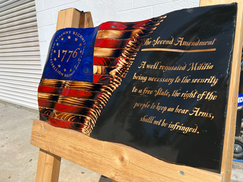 Each flag is carefully handcrafted and sculpted into a flowing, wavy design that mimics a flag in motion. The Second Amendment is engraved on the right side, making this a striking, patriotic centerpiece.