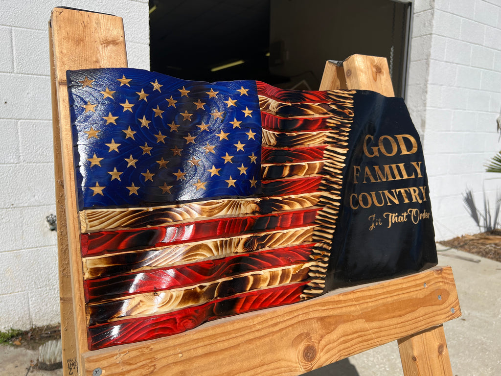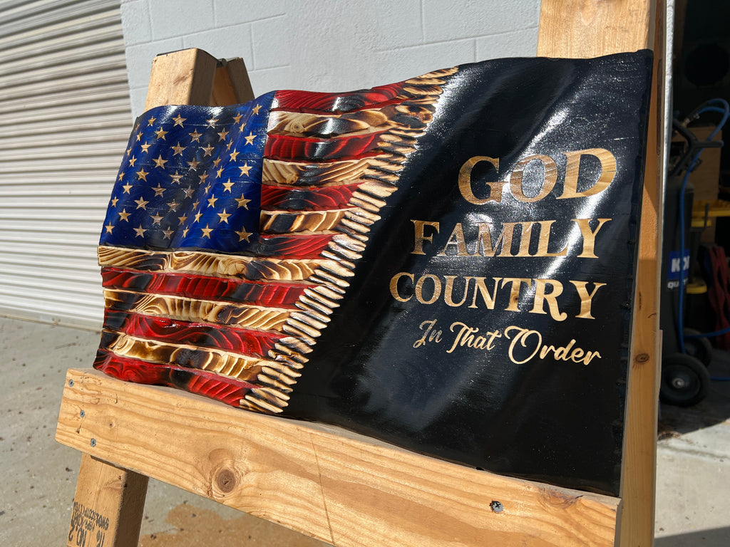 Each flag is hand-carved and features clean lines and sharp detail. The phrase “God Family Country” is engraved on the right side, creating a meaningful and eye-catching display piece.