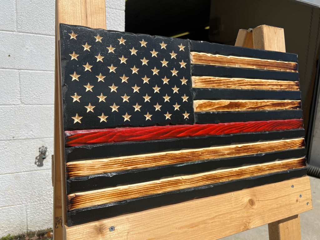 Built from premium solid wood, each flag is carefully layered, torched, and hand-stained to showcase the natural beauty of the wood grain. The single bold red stripe stands out against the black and natural tones — representing the Thin Red Line that separates danger from safety.