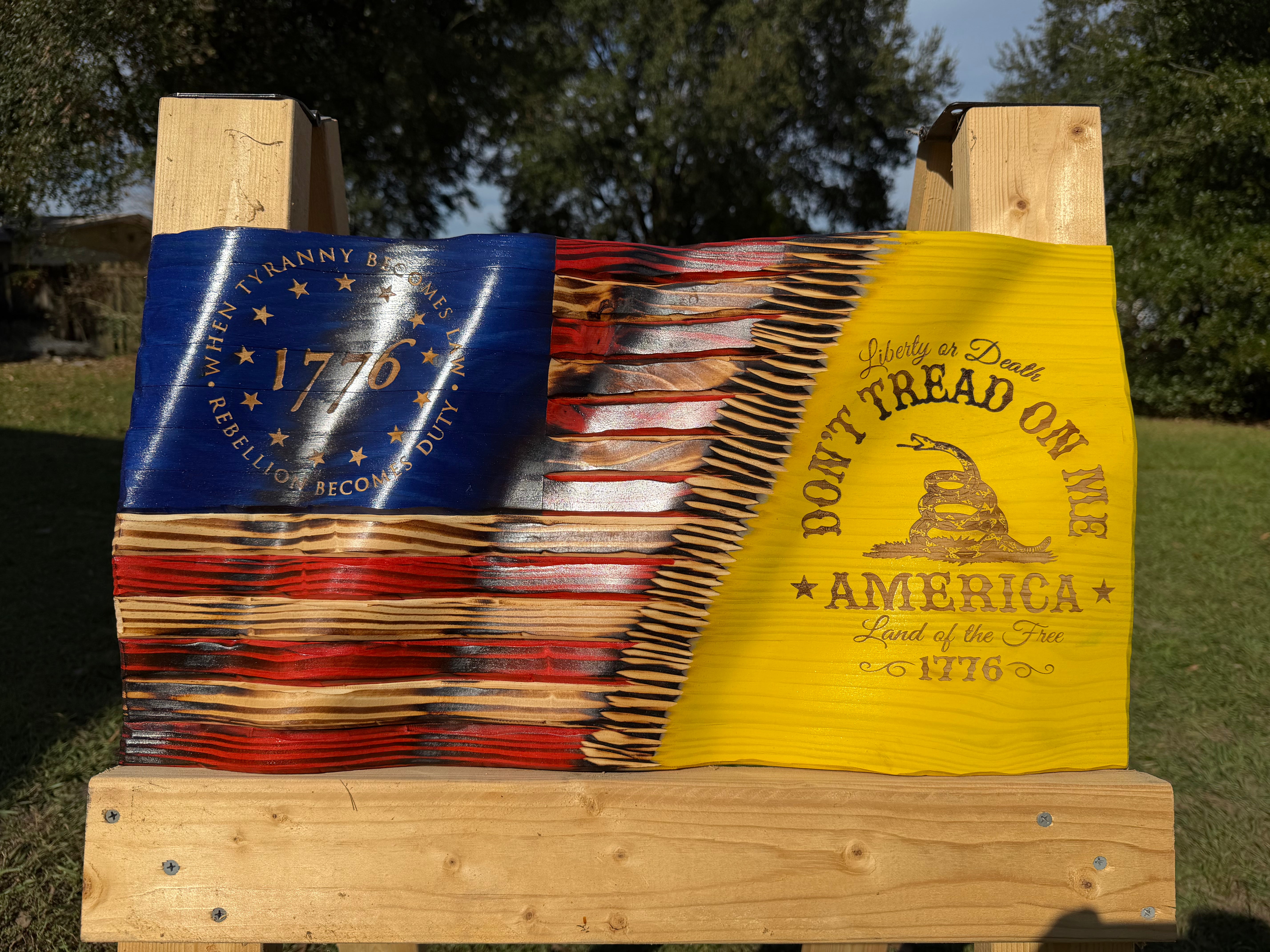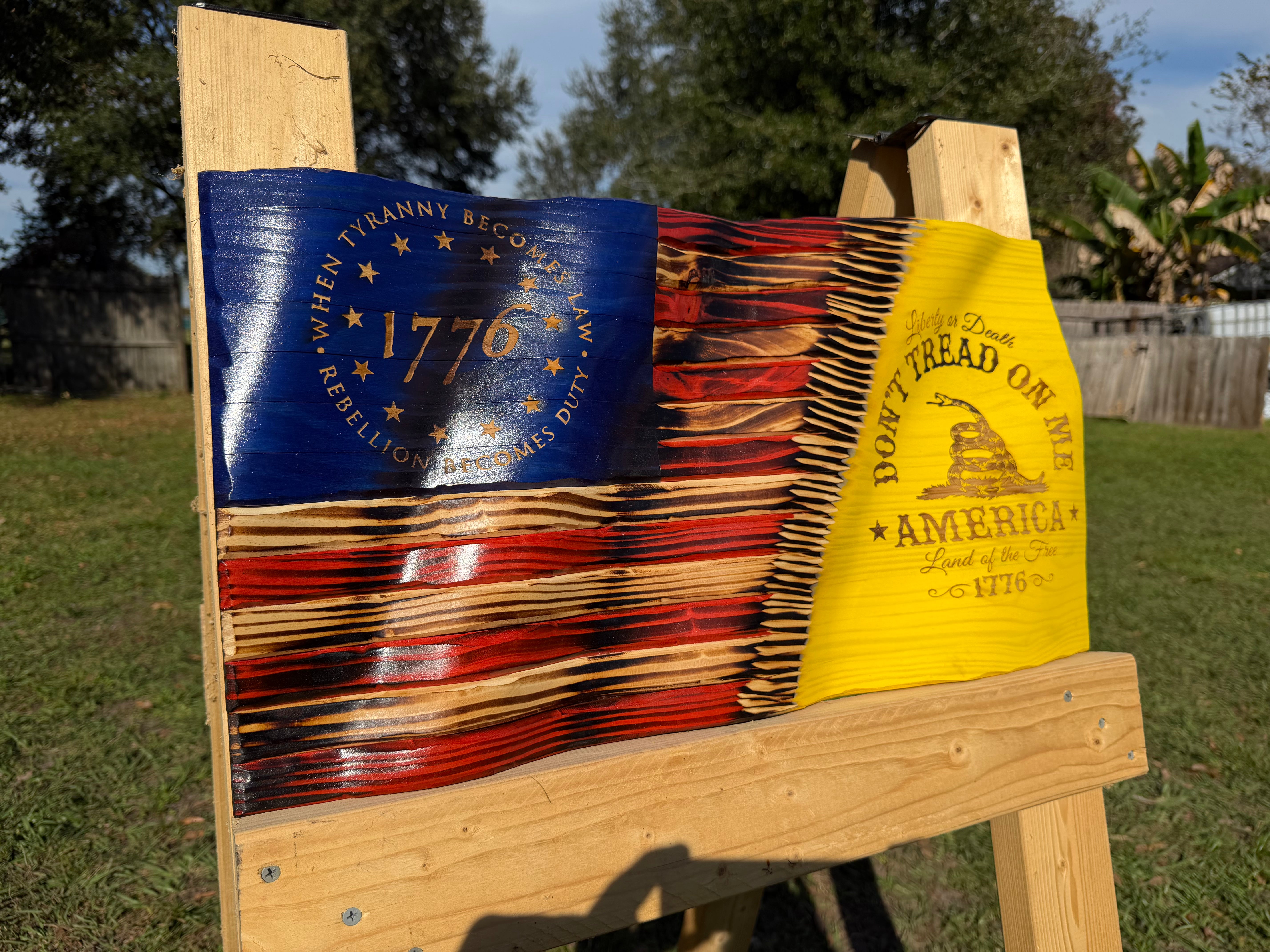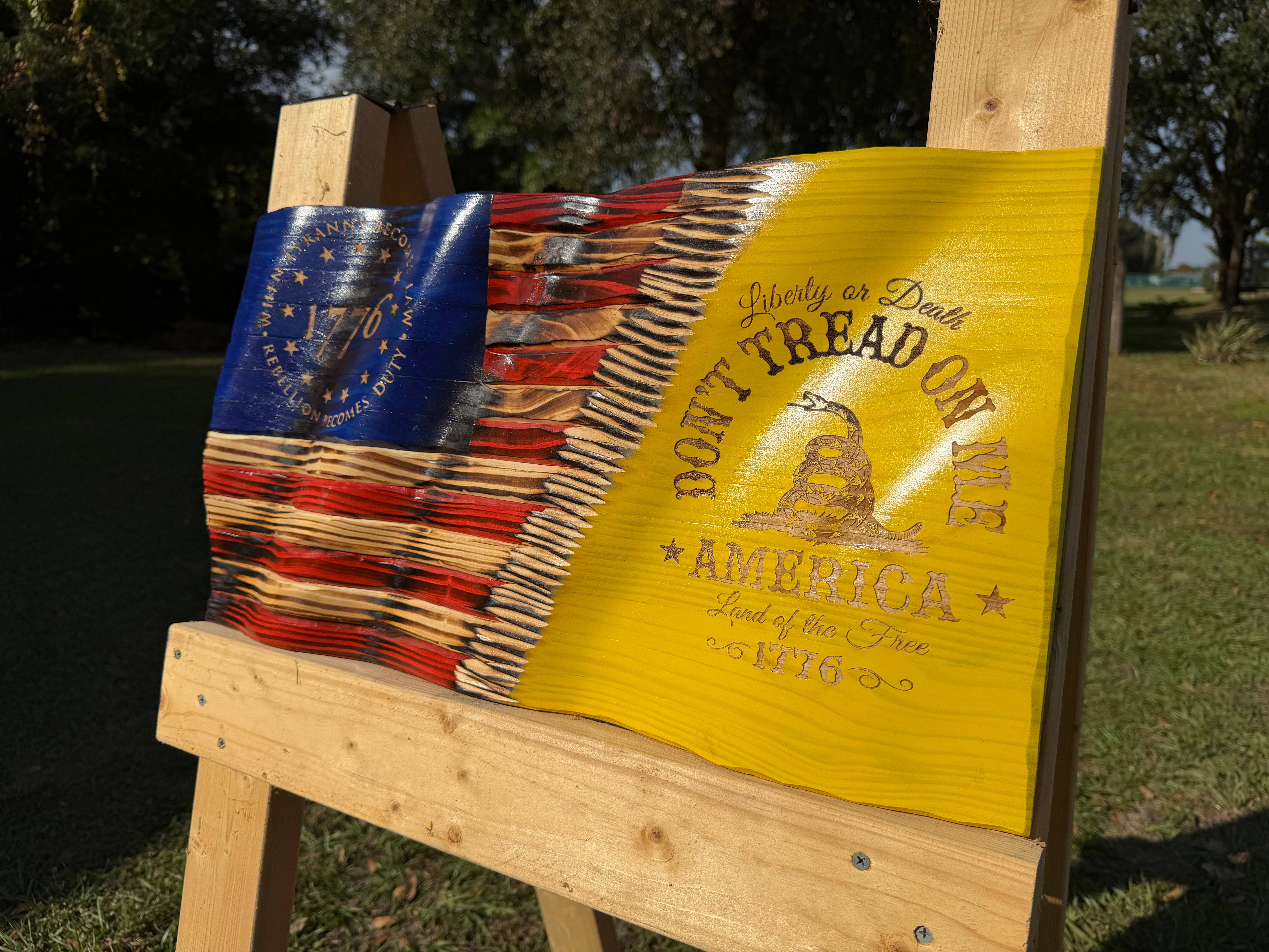Make a bold statement of freedom and defiance with this handcrafted Wavy Wooden American Flag, featuring the iconic “Don’t Tread on Me” motto and Gadsden Snake laser-engraved into the right-hand side. Carefully hand-carved to create a lifelike waving effect, each piece is crafted from premium solid wood and finished to highlight its natural grain and depth.